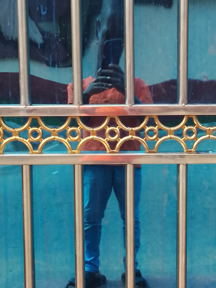 - "The scene, located in Onitsha, Nigeria, displays the full-body reflection of an individual in a blue-tinted glass panel, viewed through a metal barrier" by FM-2cBFK2, licensed under CC BY 4.0