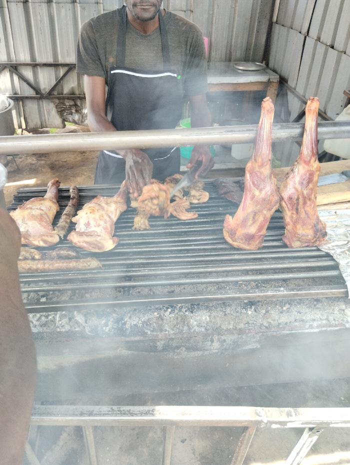 The image captures a close-up scene of meat being grilled outdoors, specifically in Viwandani ward, Kenya