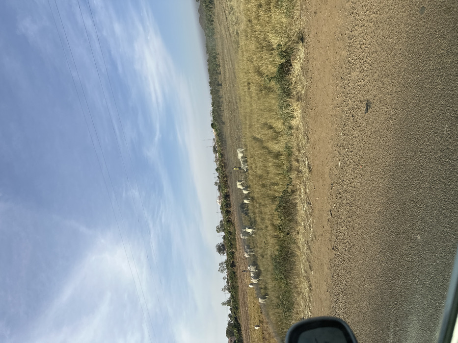 The image depicts a rural or semi-urban landscape in the city of Nabatum, Nigeria, under a bright, partly cloudy blue sky. In the immediate foreground on the left, a portion of a vehicle's side mirror is visible, suggesting the photograph was taken from inside a moving or stationary vehicle. Below the mirror, a paved road surface transitions into a wider, unpaved dirt shoulder that stretches across the lower portion of the frame. To the right of the road, a large field covered primarily with dry, light brown to yellow grass extends into the midground. Scattered greener patches of vegetation are present. Approximately two dozen light-colored cattle, predominantly white or light grey and appearing to be Zebu, are distributed throughout this field, actively grazing. At least two human figures are present among the cattle. One individual, dressed in a yellow shirt, stands towards the center-right within the herd, appearing to supervise the animals. Another less distinct figure is visible further to the left. In the background, a line of trees marks the horizon, beyond which faint structures or buildings are discernible, indicating a distant settlement. Power or utility lines traverse horizontally across the upper mid-section of the sky. The overall lighting suggests daytime conditions.