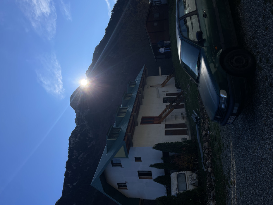 The image depicts a rural mountainous scene in Bistrica, Montenegro, under a clear blue sky. A bright sunburst is visible behind a dark, rugged mountain peak dominating the background. In the midground, a two-story, white-walled building with a dark green corrugated metal roof stands prominently. The building features multiple windows with dark frames and two exterior wooden staircases leading to upper-level doors. To the left of this building, a white, older model caravan is parked, partially obscured by slender evergreen trees. In the foreground, a dark green hatchback car, possibly a Volkswagen Polo, is parked on a gravel surface, facing towards the right. Its license plate, "HN-MN-166", is partially visible. Between the main building and the car, several large grey pipes lie on the ground amidst scattered debris. To the right of the main building and behind the green car, a smaller, dark brown wooden cabin-like structure is visible. Two individuals in light-colored clothing are standing outside this cabin, facing towards the left side of the frame. The overall scene is illuminated by strong sunlight, casting long shadows.