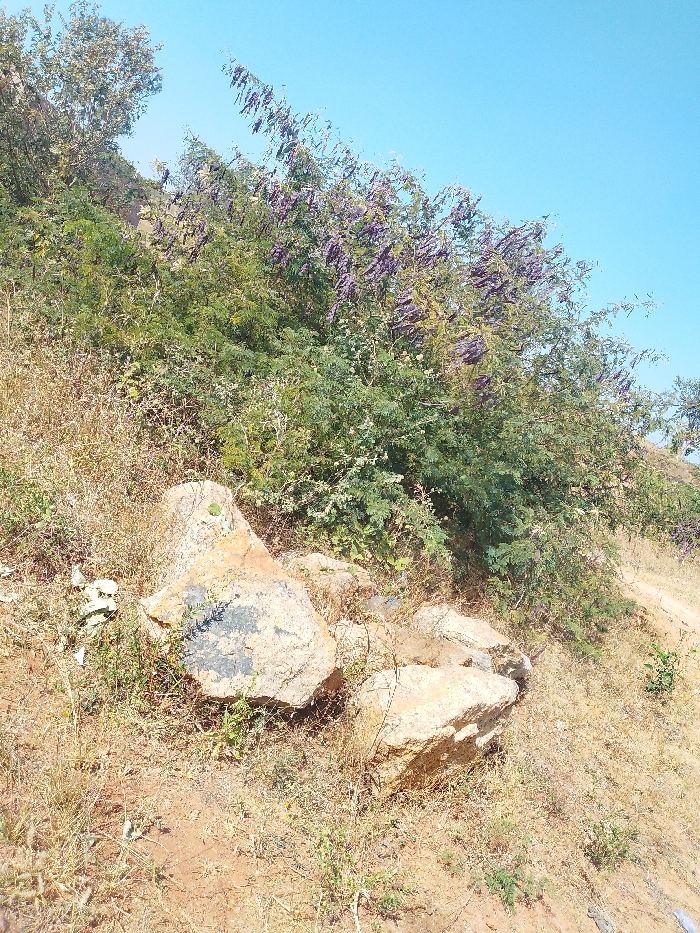 The image displays an outdoor natural landscape located in Reifild-Ist, Nigeria, under a clear, light blue sky. The terrain is characterized by a gentle slope, covered primarily with reddish-brown earth and sparse, dry, yellowish-brown grasses. In the foreground and midground, several large, irregularly shaped light-brown rocks are partially embedded in the soil; one prominent rock in the center-left exhibits a distinct dark, irregularly shaped patch on its surface. Above and behind these rocks, a dense bush or small tree with green foliage is heavily covered in numerous clusters of purple flowers or seed pods. Additional green shrubbery is interspersed with the dry vegetation. A portion of another tree is visible in the upper left corner. A narrow dirt path or eroded area is present on the far right side of the frame. Small pieces of white debris are scattered near the central rocks. No human figures or discernible man-made structures are present.