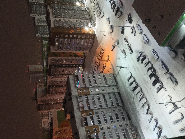 cityscape at night, dominated by apartment buildings and a parking lot. The parking lot is mostly covered in snow, with many parked cars. Streetlights illuminate the area, casting shadows on the snowy ground. The apartment buildings are tall and have multiple windows. The overall impression is a cold, urban environment.