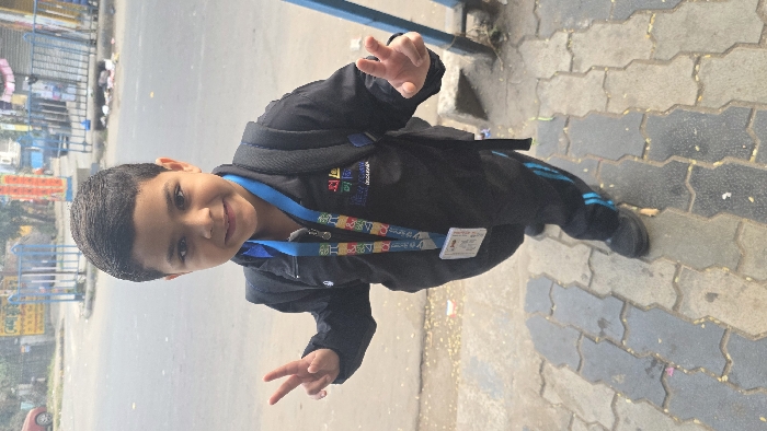 A young child with a dark jacket and blue accents stands on a sidewalk, making a peace sign with one hand and waving with the other. They wear a lanyard around their neck with a name tag. A street and various buildings are visible in the background, indicating an urban setting. The sidewalk features a repeating pattern of interlocking paving stones.