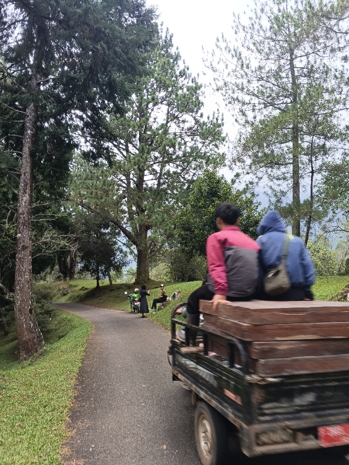 A winding asphalt road is lined with trees and grassy verges. Two figures sit on the back of a truck, traveling along the road. Further down, a person stands near a parked motorcycle, while another sits on the grass nearby. The sky is overcast, and the surrounding landscape is a mix of trees and greenery. The focus is on the two people on the truck, with the rest of the scene providing context for their journey.