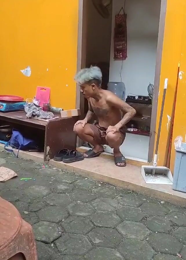 - "A shirtless, tattooed, and fair-haired person gets up from a squatting position on the patio of a yellow house" by FM-U0yGQ2, licensed under CC BY 4.0