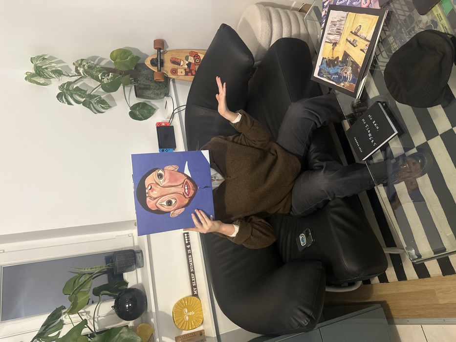 A person sits on a black leather chair, holding a vinyl record with a cartoonish portrait over their face. The person is wearing a brown sweater and gray pants. Next to them is a glass table with books and a black baseball cap. Behind the chair is a skateboard, a Nintendo Switch, and a monstera plant. In the bottom left corner of the image, there is a window with another monstera plant in front of it.