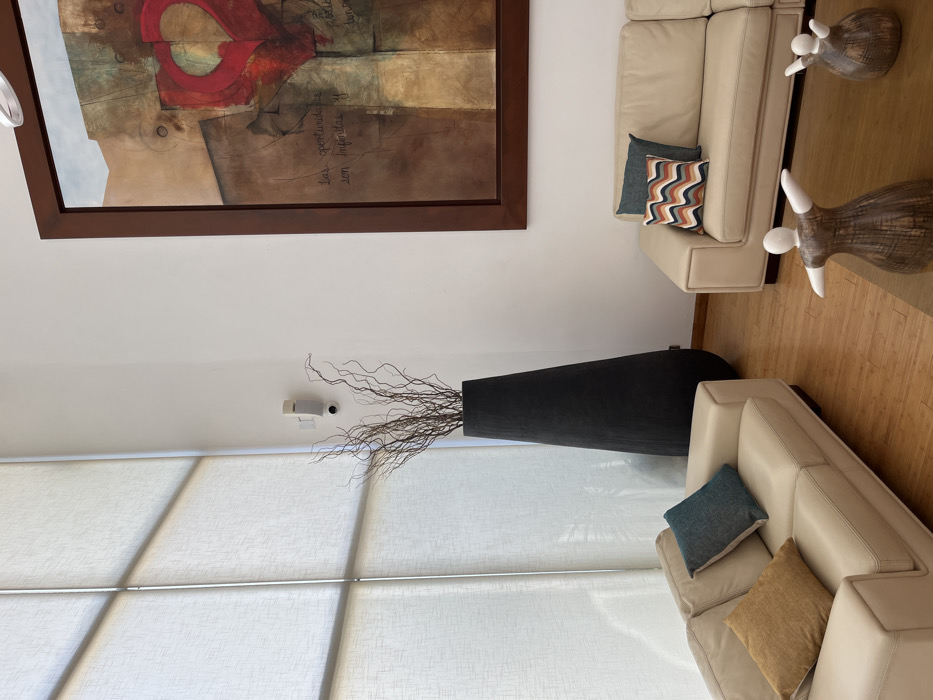 This image depicts a modern indoor living or waiting area located in San Bernardino Tlaxcalancingo, Mexico. The room features plain white walls and a light-toned wooden plank floor. On the left, a large window spans a significant portion of the wall, covered by multi-panel, light-colored vertical blinds that diffuse natural light. To the right of the window, against the white wall, a tall, dark gray, conical floor vase holds numerous dry, bare branches. Above this vase, a small, off-white security camera or sensor is mounted on the wall, positioned below another white wall-mounted fixture. Two light beige or cream-colored two-seater sofas are visible. One sofa is positioned towards the left foreground and features a rectangular mustard-yellow pillow and a square dark teal pillow. The second sofa is partially visible on the right, further back, and is adorned with a square dark teal pillow and a rectangular pillow featuring a wavy pattern in white, orange, and brown tones. On the white wall to the right of the tall vase, a large abstract painting is mounted within a thick dark brown frame. The artwork displays a composition of earthy tones (browns, beiges, grays) with a prominent red, segmented heart-like motif. Partial Spanish text is inscribed on the painting, reading: "Las oportunidades son infinitas y...". In the foreground, a dark-surfaced coffee table, possibly glass-topped, is partially visible. Upon this table are two stylized human-like figurines made of a textured, wood-like material, one larger than the other, both depicted with outstretched arms. A modern, circular white ceiling light fixture is partially visible in the upper right corner of the image. No individuals are present in the scene.
