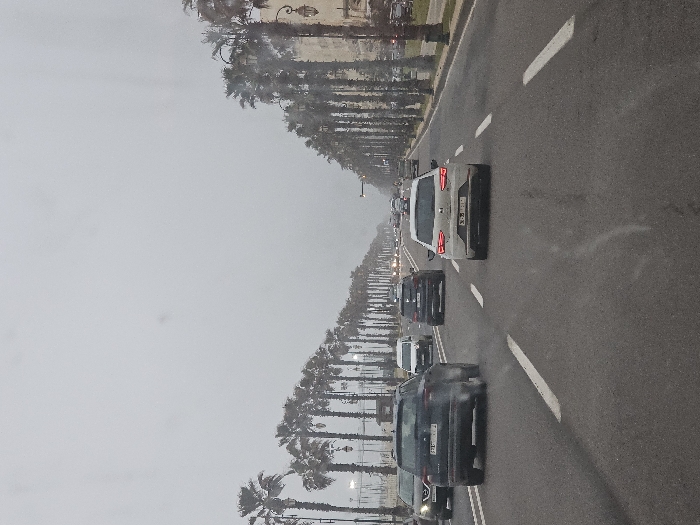 A long road is lined with tall palm trees on one side. Cars are driving along the road, appearing as a single file. The sky is overcast, creating a gloomy atmosphere. The road markings are visible, and the overall scene suggests a busy urban area with a coastal feel. The perspective of the shot shows a diminishing view towards the horizon, accentuating the length of the road and the line of cars.