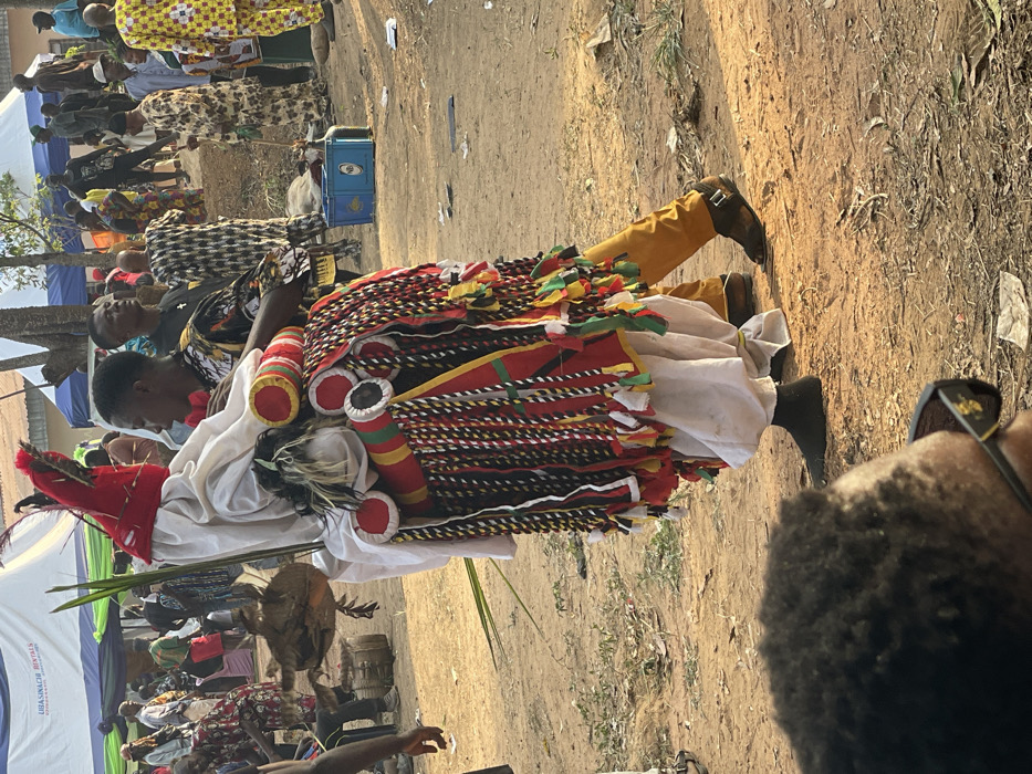 An outdoor scene in Umueze, Nigeria, depicts a public gathering with a central focus on a masquerader