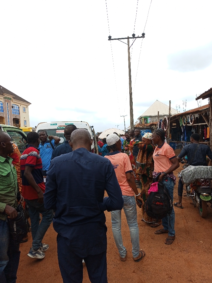 group of people gathered in the street in front of a white van in Idah, Nigeria (latitude: 7.101, longitude: 6.729). The people are standing on a dirt road. There are several buildings in the background, including a white building with a tin roof. There are multiple power lines running along wooden poles in the middle of the scene. The people appear to be talking to each other or waiting for the van. The van has the words "Kogi State" written on the side. There is a motorcycle parked on the right side of the scene, and some goods are displayed on a table behind the van. The sky is cloudy. The majority of the people are wearing casual clothing. There are some signs in the background, but the text is not legible. Several of the people are holding bags or purses. There are no children visible in the scene. The scene is relatively bright, indicating that it is midday. The image was likely taken from a distance.