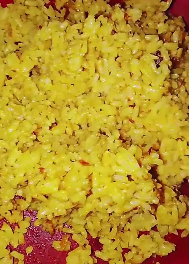 A close-up video shows yellow rice in a red bowl. A metal spoon scoops some of the rice and drops it back into the bowl. The rice appears slightly moist and seasoned. The background is blurry.