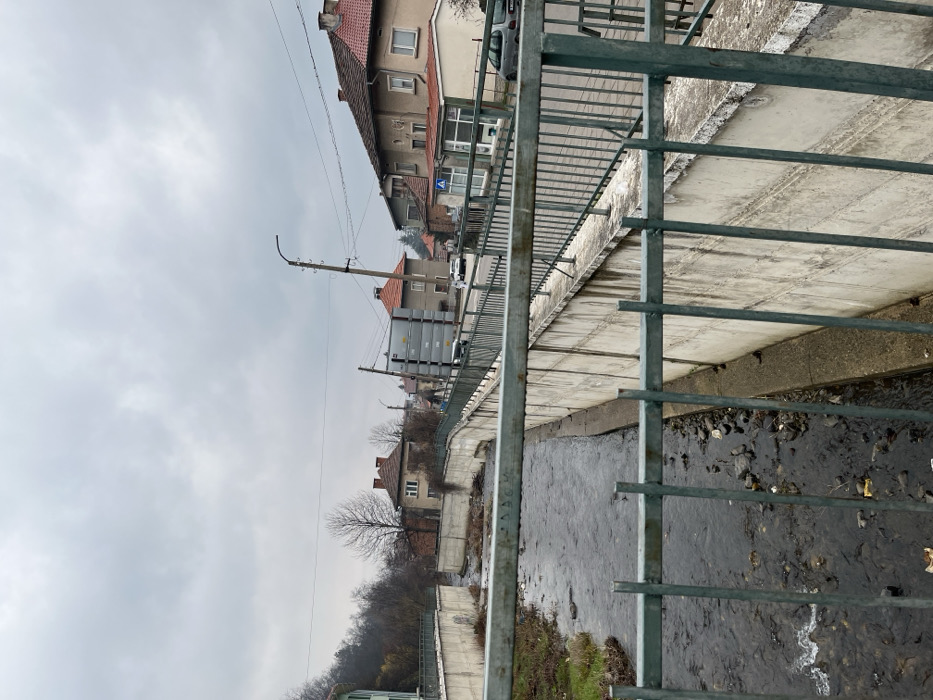 The scene depicts a narrow river or stream in Berkovitsa, Bulgaria, viewed from an elevated position, likely a bridge. In the foreground, a dark green metal railing, possibly part of a bridge, spans the lower portion of the frame; faint graffiti is visible on its upper bar. The river, flowing from background to foreground, contains dark water, rocks, and debris, channeled between concrete retaining walls on both sides. The left bank exhibits sparse brown vegetation. Parallel to the river on the right, a paved street is visible, separated from the river by a concrete wall topped with a matching dark green metal fence. Along this street on the right, a series of buildings are present. The closest building features a storefront with multiple windows and a beige facade, displaying a blue and white pedestrian crossing sign nearby. Further down the street, other residential-style buildings with red-tiled roofs and light-colored facades are visible. One prominent building has multiple stacked, grey, rectangular modules on its side facing the street. Utility poles with overhead power lines line the street. A white car is observed on the street in the distance, traveling away from the viewer, and a dark-colored car is parked on the right side. The left side of the background shows an upward-sloping hillside with leafless deciduous trees and some evergreen foliage, interspersed with residential buildings featuring red-tiled roofs. The sky is uniformly overcast and grey, indicating a cloudy day. No individuals are discernible in the image.