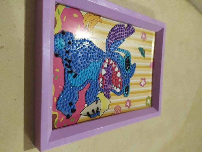 The image depicts a framed artwork, located in Harasta, Syria, resting on a flat, light beige surface. The rectangular frame is made of a light lavender-purple material, possibly wood. Inside the frame is a diamond dot painting featuring the character "Stitch" from Disney's Lilo & Stitch. Stitch is rendered in various shades of blue diamond dots, with a wide-open mouth showing red, white, and purple dots for its inner mouth and teeth, indicating an energetic expression. Its left arm is raised. Stitch is depicted sitting on a large, pink-frosted donut adorned with yellow and green sprinkles, also created with diamond dots. To the left of the character, a bunch of yellow bananas is visible, and to the right, a yellow object resembling a scoop of ice cream is partially obscured. The background behind the character consists of a light yellow field with thin white vertical stripes, interspersed with small decorative elements including red, yellow, and white flowers, and green leaves. The scene is illuminated by ambient, even lighting.