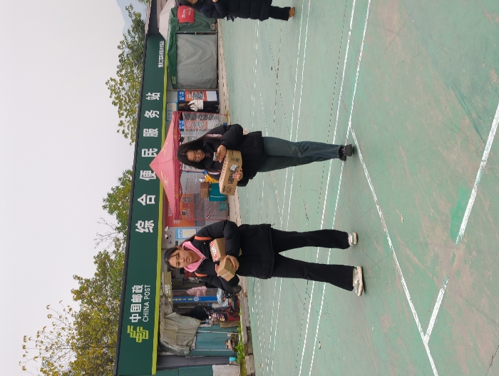 Two women carry boxes in front of a China Post office. The women are wearing dark jackets and pants. The setting appears to be an outdoor area, possibly a court with white lines on the ground. There's a booth or tent visible behind them, suggesting an event or temporary setup at the location. Other people stand nearby, in front of the post office.