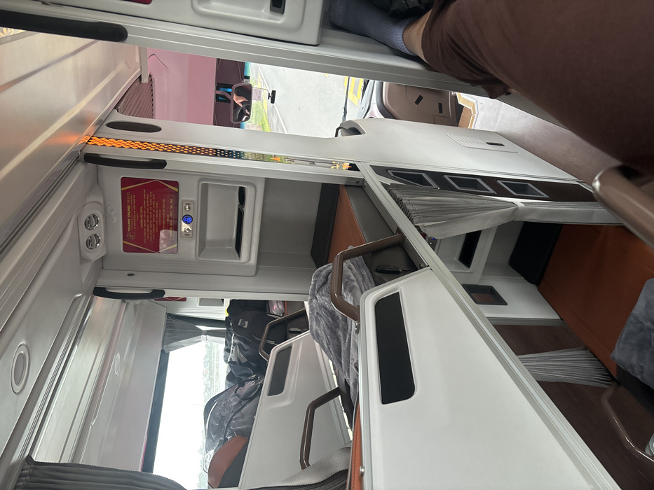 An interior view shows a multi-tiered bus or van. Seating or sleeping berths are stacked along the side. White and brown accents are visible. Gray curtains provide privacy. A window is visible on the lower level. A small, red sign is mounted near controls, including power and light switches. Passenger legs are visible in the aisle. Outside through the windshield, the sky and road can be seen.