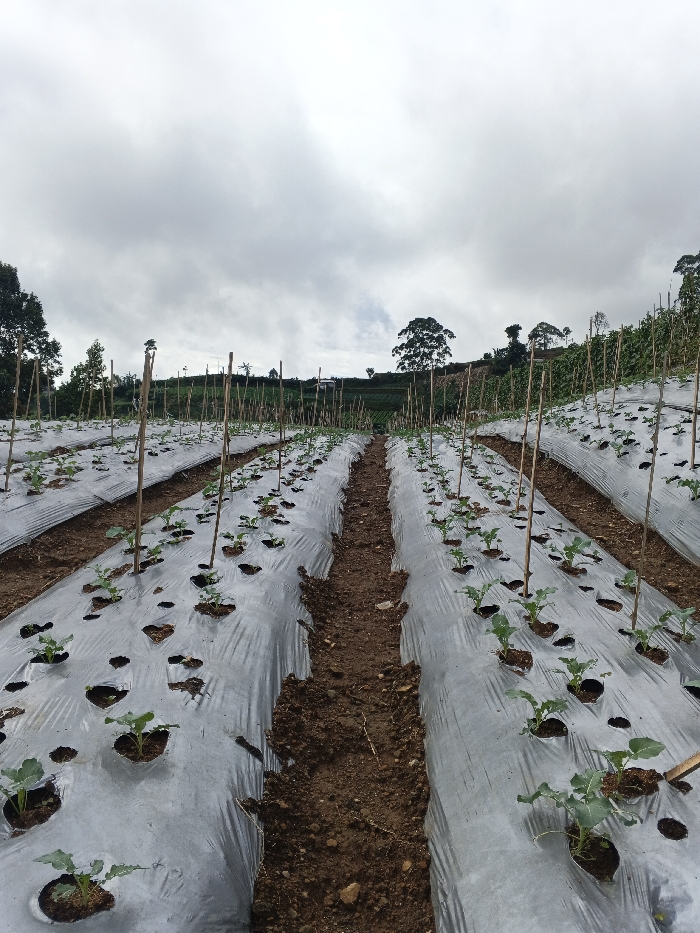 - "A rural hillside farm under a cloudy sky showcases rows of young, green plants emerging from holes in silver plastic mulch" by FM-gp6DI2, licensed under CC BY 4.0