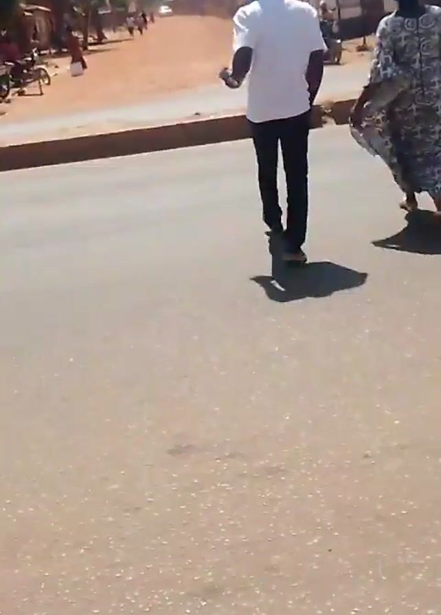 two people walking away from the camera on a paved road in a residential area. The person on the left is wearing a white short-sleeved shirt and dark pants, and the person on the right is wearing a patterned dress. The road is a light gray color, and there is a concrete curb on the left side of the road. On the other side of the curb, there is a dirt area with a few motorcycles parked. There are several buildings and trees in the background. The sky is bright and clear.