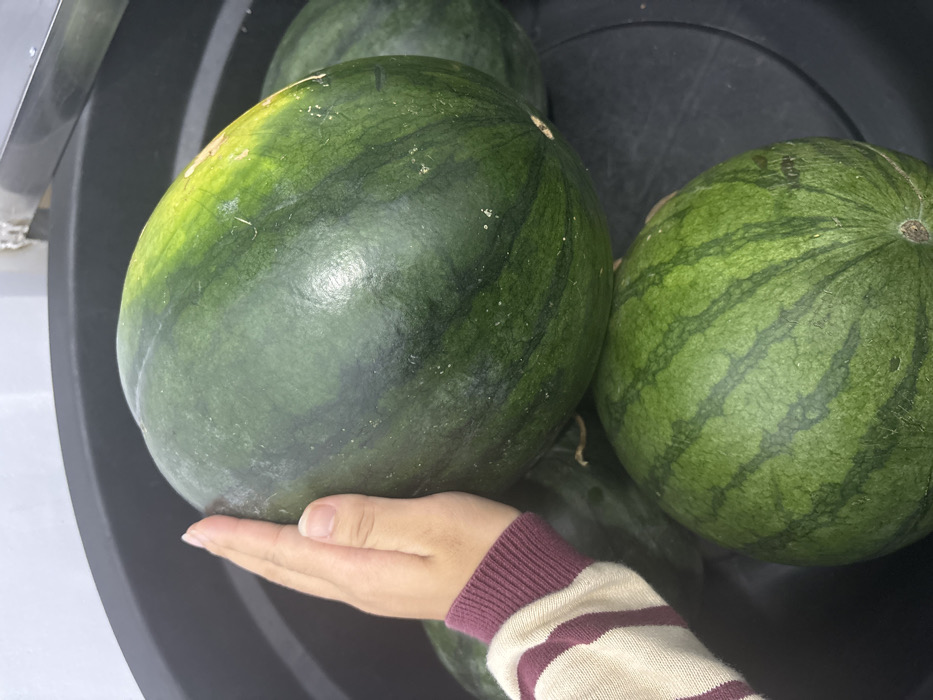 - "A person's hand supports a small, round watermelon in a black plastic container" by FM-4BM9L2, licensed under CC BY 4.0