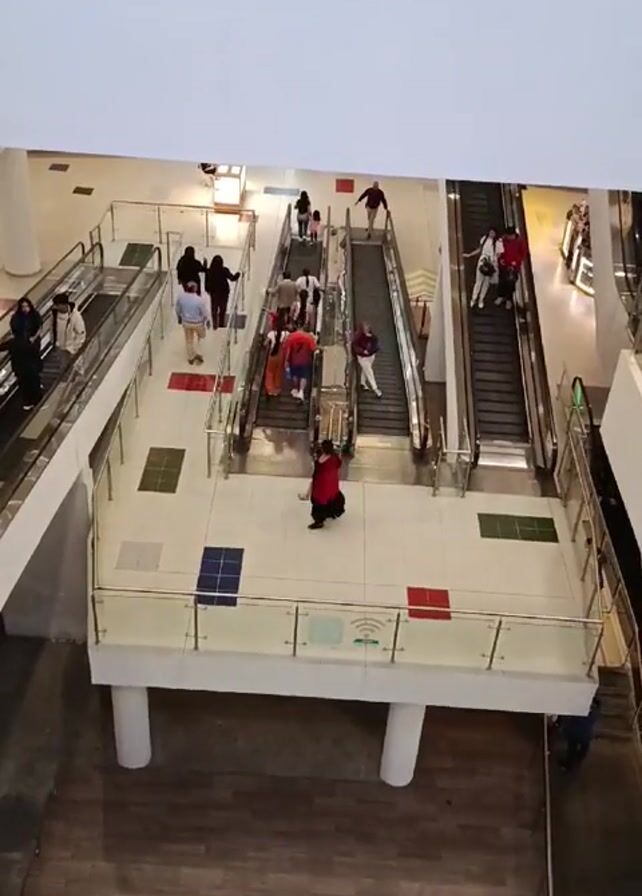 n elevated platform in a shopping mall with escalators going up and down. Several people are on the platform and using the escalators. Some people are walking on the platform. The platform is white with square insets of green, blue, and red colors. The platform is surrounded by a glass barrier. There is a wooden floor beneath the platform. The environment is brightly lit.