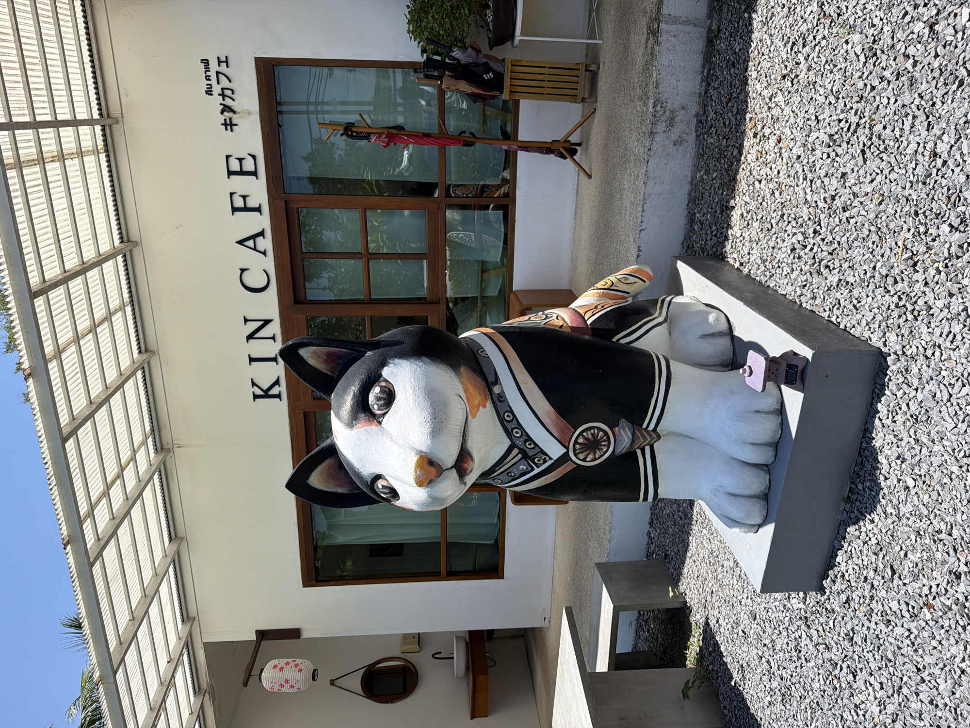 An outdoor scene in Kathu, Thailand, depicts the facade of "KIN CAFE" under bright daylight. The cafe building is white with large wooden-framed windows reflecting green foliage and sky. Above the windows, the cafe's name is displayed in black English letters, with smaller Thai and Japanese script above it. A translucent corrugated roof extends over the cafe's entrance area, supported by a metal frame. In the foreground, centered, stands a large, multi-colored cat statue on a grey rectangular pedestal. The cat statue is predominantly black and white, with areas of orange-brown on its face and limbs, and it wears a decorative garment resembling traditional attire with a central medallion design. A small, purple miniature lantern-like object rests on the pedestal next to the statue's right front paw. To the left of the statue, an outdoor seating area features a grey concrete table and an accompanying bench. Further left, against the white wall, a white ceramic sink is mounted on a wooden vanity, with a circular wooden mirror hanging above it. A white paper lantern with red floral patterns hangs from a wooden beam overhead. To the right of the cat statue, near the cafe entrance, a wooden coat rack with a red umbrella is visible, alongside a wooden stand holding several dark-colored umbrellas. A small bonsai tree sits on a white metal table to the far right. The ground is covered with light grey gravel, indicating an outdoor, non-paved area. No people are visible in the scene.