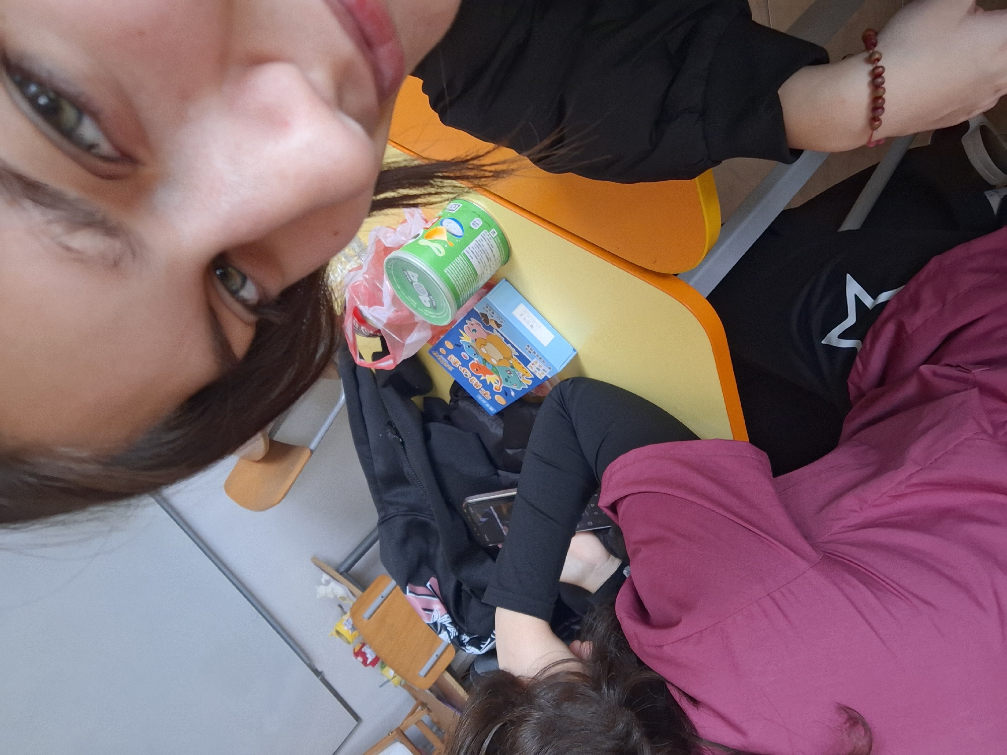 The image is an overhead shot taken by a person (presumably a selfie) who is positioned at the top left of the frame. The person has dark hair and visible eyes, and a portion of their face is in focus. The scene appears to be indoors, possibly a classroom or a casual dining area. There are two individuals visible. The person taking the photo and another individual who is seated at a yellow and orange desk. The second individual is wearing a dark jacket and a maroon top. They are seated and appear to be using a mobile device (possibly a smartphone) placed on their lap. The desk has several items on it: a green can, a blue box with cartoon images, and a transparent plastic bag. A black jacket also rests on the desk. In the background, there's a pale gray wall and several yellow chairs. There's a chair and possibly a table slightly below the seated person, and the objects seem to be distributed across a room that is not fully captured in the frame. There is no immediate, verifiable evidence of the location being Panagyurishte, Bulgaria, and thus cannot be stated with certainty from visual clues in the photo.