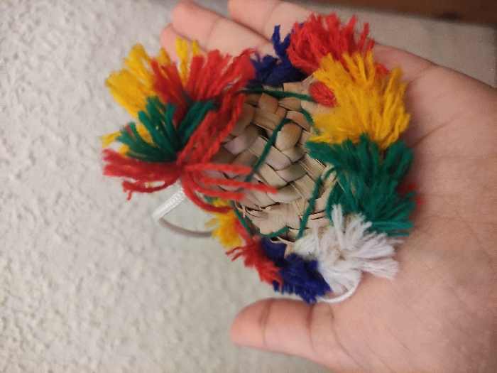 A small, woven palm leaf disc is held in a hand. The disc is adorned with colorful tassels made of yarn. The tassels are arranged in a circular pattern around the edge of the disc and include shades of red, yellow, green, blue, and white. A thin white elastic band is attached to the disc, suggesting it could be worn as a decorative accessory.