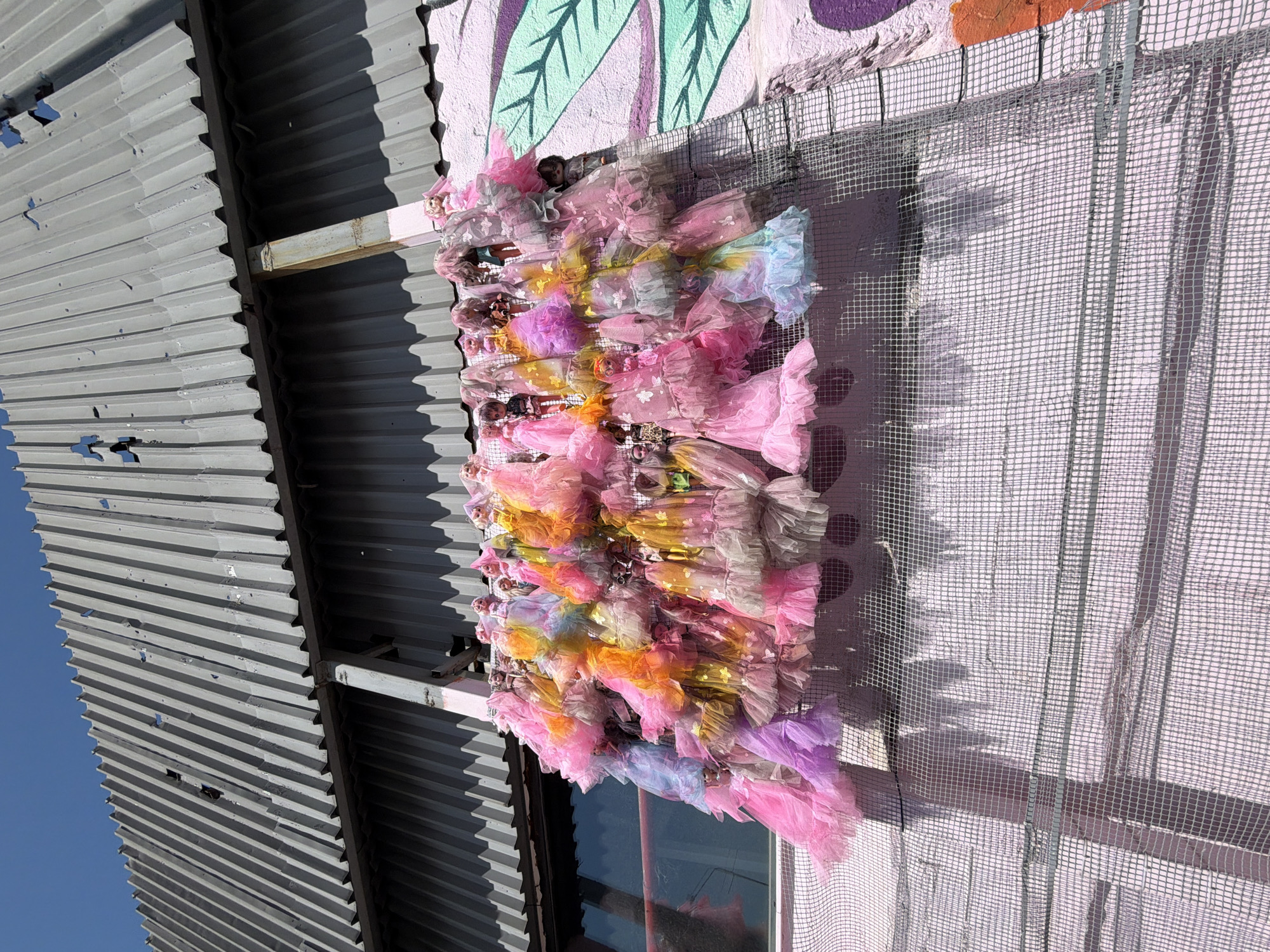 The image displays an outdoor art installation on a building facade in Thessaloniki, Greece, specifically identified as the "Doll House" near Mavili Square. The central subject is a dense arrangement of numerous miniature dolls, predominantly of the Barbie type, affixed to a gray square-grid wire mesh. Each doll is dressed in a multi-layered, ruffled tulle dress or skirt, exhibiting a vibrant spectrum of colors including various shades of pink, orange, yellow, blue, purple, and gray; some dresses feature subtle butterfly motifs. The dolls are oriented generally upright, with their upper bodies secured to the mesh. The wire mesh is mounted against a textured, light pink building wall. On the left side of this wall, a dark-framed rectangular window is visible. The pink wall also features fragmented mural art on its right side, including a large, stylized green leaf design and an irregular orange shape towards the bottom right. Directly above the pink wall and the doll installation, a gray corrugated metal facade, possibly a roof or upper building section, extends towards a clear blue sky. This corrugated metal shows signs of wear and minor damage. A vertical metal support beam, partially painted pink at its lower section, is visible between the wall and the corrugated structure. The scene is illuminated by strong, natural daylight, casting distinct shadows of the wire mesh and the dolls onto the pink wall. No people are visible.