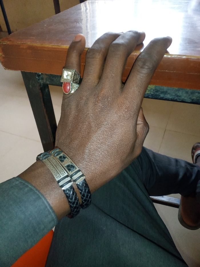A close-up depicts a dark-skinned hand adorned with a ring and bracelets. The ring, worn on the thumb, features a silver setting with a clear, square gemstone stacked above a red, round stone. Two bracelets embellish the wrist, one silver with a Greek key design, the other a black braided leather band. The hand rests on a wooden table. The person wears a gray long-sleeved shirt and dark pants, with a glimpse of a brown shoe visible.
