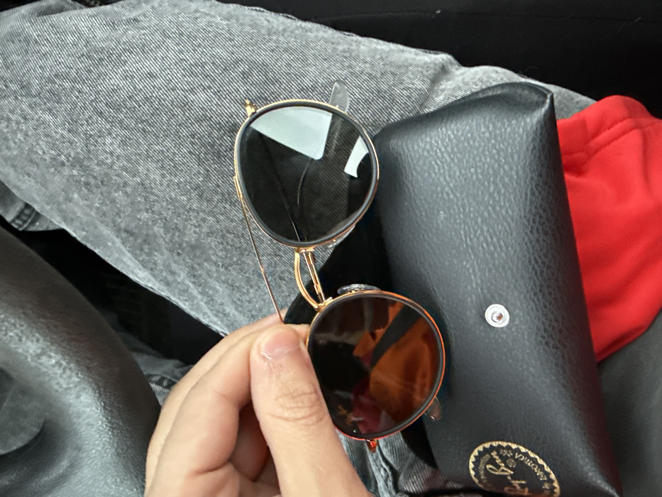 - "The image displays a pair of round-frame sunglasses with gold-colored metal accents, including a double bridge, being held by a human hand with light skin tone" by FM-Pj81k2, licensed under CC BY 4.0