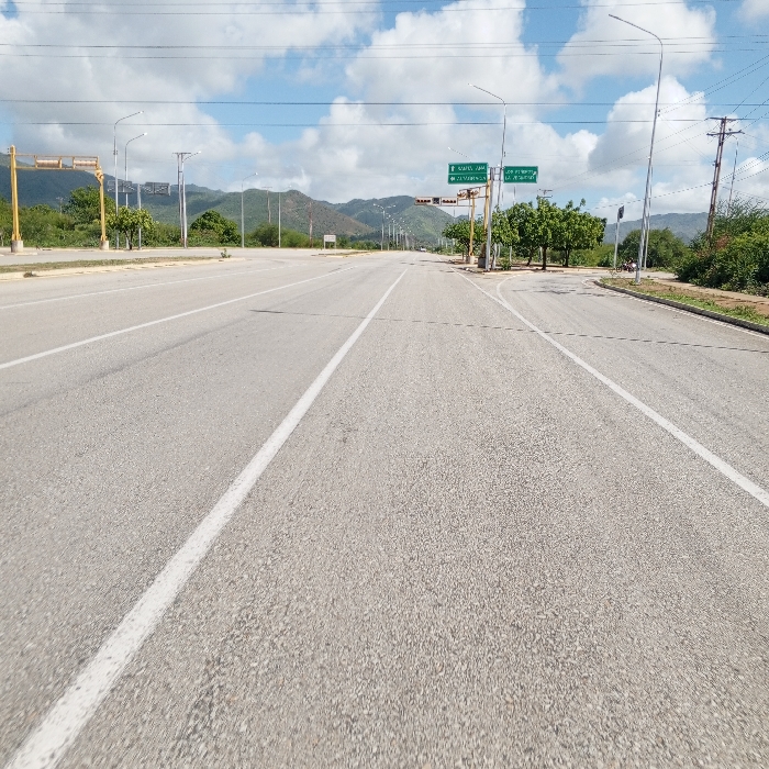 A straight, empty gray asphalt road stretches into the distance under a bright blue sky dotted with puffy white clouds. White lines mark the lanes. Power lines run overhead. Green hills rise in the background. Traffic lights hang on yellow frames above a grassy median with trees. Streetlights line the road's edge. A few scattered trees and shrubs grow along the side of the road.