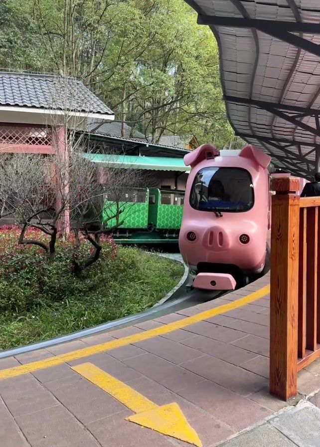 - "The camera focuses on a pink, pig-shaped train car that is pulling into a covered station on a paved track with a yellow directional arrow" by FM-7eaFY2, licensed under CC BY 4.0