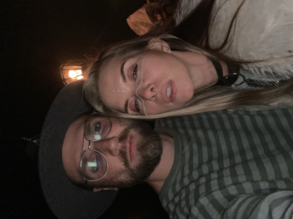 A man and woman pose for a selfie in a dark setting with a light source in the background. The woman, with blonde hair and decorated with a jeweled face adornment and nose ring, lies atop the man. He wears glasses and a hat. Both have glitter on their faces. The man has a beard, and the woman wears a choker. He is wearing a striped shirt.