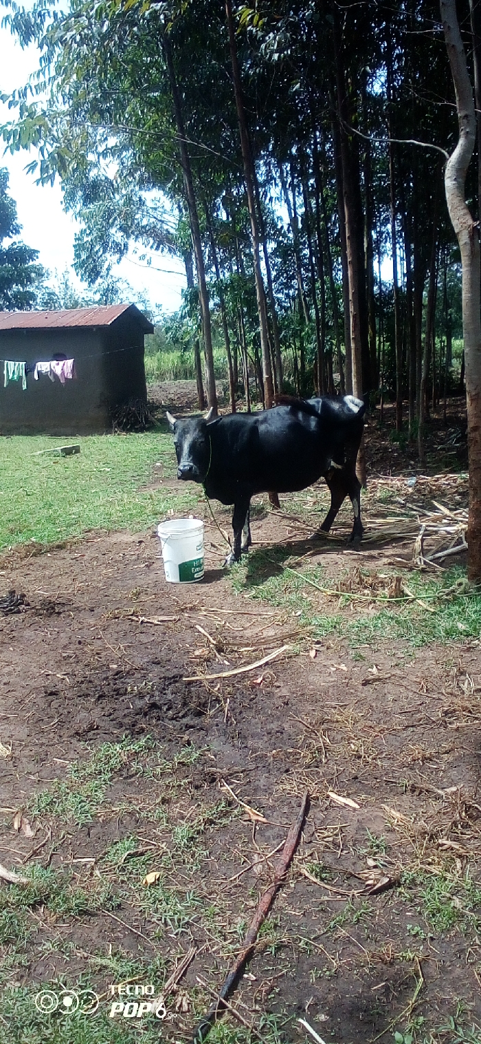The scene is set outdoors in Lugari ward, Kenya, under a bright, partly cloudy sky. A black cow with short horns and a light-colored rope around its neck stands centrally, facing slightly left. The cow exhibits white markings on its hindquarters and left rear leg. A white plastic bucket with green lettering partially visible as "HI" and "Emul" rests on the ground near the cow's front right leg. The ground is a mix of reddish-brown dirt, patches of green grass, scattered dry organic debris, and a dark, possibly muddy patch in the immediate foreground. In the background, to the left, a single-story building with dark, possibly earth-colored walls and a rusty corrugated metal roof is present. A clothesline is strung across the front of this building, displaying several items of clothing, including what appears to be a shirt and shorts, hanging to dry. To the right of the building and extending across the right side of the frame, a dense grove of numerous tall, slender trees with green foliage (consistent with eucalyptus) is visible. A tree with lighter bark stands on the far right edge of the frame. No human subjects are present in the image.