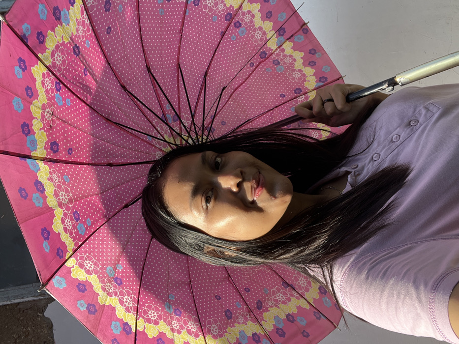 An outdoor image captured in Kecamatan Pati, Indonesia, features a female subject positioned centrally. She has dark, straight hair parted to her left and wears a light lavender short-sleeved collared shirt. Her face is illuminated by direct sunlight, showing a slight smile as she looks towards the viewer. Her right hand, wearing a ring on the ring finger, grasps the silver-colored handle of a large, open pink umbrella positioned directly behind and above her head. The umbrella canopy displays a pattern of white polka dots on a pink base, with a decorative band of white, yellow, blue, and purple floral motifs near the edge. The background consists of a plain, light-colored wall to the right and a darker, indistinct surface to the left.