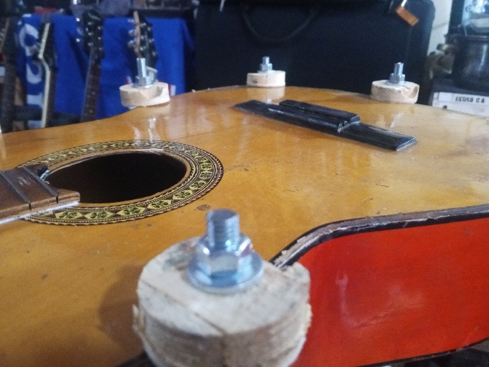 A close-up shot shows a classical guitar undergoing repair. Four wooden cylinders, each topped with a nut and bolt, are strategically placed to apply pressure to the instrument's top. The guitar's bridge, a long, black component, is positioned between two of the cylinders. The soundhole, adorned with a decorative pattern, is visible on the left side of the frame. The instrument's red side adds a pop of color, contrasting with the light brown of the guitar's top. The background shows various objects, including other guitars, suggesting a workshop environment.