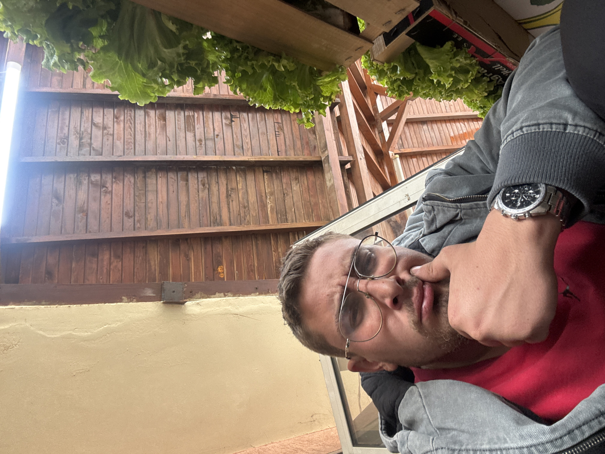 The image depicts a male individual, appearing to be in his 20s or 30s, taking a selfie from a low angle within what is identified as a covered outdoor or semi-outdoor commercial establishment in Haskovo, Bulgaria. The man, positioned centrally in the lower half of the frame, has short brown hair, stubble, and wears clear-framed aviator-style eyeglasses. He is dressed in a red t-shirt under a grey zippered hooded jacket. His right hand is raised, with his thumb and index finger lightly touching his chin, suggesting a pensive or posed expression. A silver-toned wristwatch with a black chronograph dial is visible on his left wrist. The background features a light beige/tan textured wall on the left. The upper and right sections of the background consist of horizontal wooden planking, indicative of a ceiling or upper wall, supported by visible vertical and diagonal wooden beams. A long, bright linear light fixture is horizontally mounted in the upper-middle of the wooden ceiling. To the right, multiple heads of vibrant green lettuce are vertically displayed in what appear to be wooden crates or shelves, suggesting a produce stall or restaurant. A partial view of a window frame or glass barrier is visible behind the man's head and left shoulder. A fragment of a cardboard box with partially visible text "Agra Hell" is present near the lettuce.