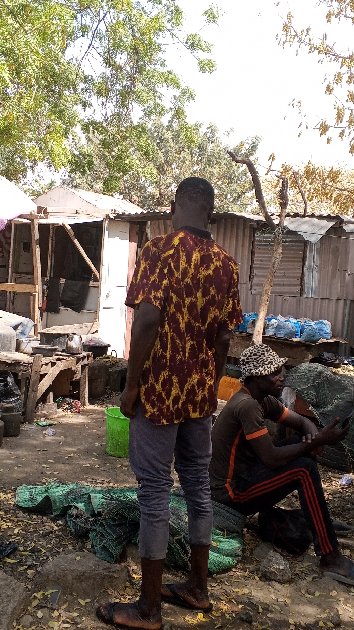 The scene is an outdoor area in Fagge A, Nigeria, characterized by an informal settlement or market environment under bright daylight. In the foreground, an adult male stands with his back to the viewer. He has a dark complexion and wears a short-sleeved collared shirt with a maroon and yellow abstract pattern, light grey athletic pants, and dark open-toed sandals. His hands are at his sides. To the right and slightly behind him, another adult male is seated on the ground or a low surface, facing towards the right side of the frame. He has a dark complexion and wears a spotted leopard-print bucket hat, a dark short-sleeved shirt with orange trim, and dark athletic pants with two red stripes down the side. He is holding a dark-colored smartphone with both hands. The ground is dry, uneven earth covered with scattered dry leaves and small rocks. Several bundles of green mesh material, resembling fishing nets, are arranged on the ground in the mid-ground. A bright green plastic bucket is visible on the ground to the left of the standing individual. In the background, multiple makeshift structures or stalls are present. These appear to be constructed from unpainted wooden frames and corrugated metal sheets, some showing signs of rust and wear. One structure on the left has an open doorway revealing a dark interior. A crude wooden table-like structure stands in front of this, holding various pots, pans, and a metal kettle. Another structure on the right has bundles of light blue bags stacked on a surface. Above the structures and in the upper portion of the frame, several trees with green foliage are visible against a bright, clear sky. A prominent bare tree branch extends into the frame from the right side.
