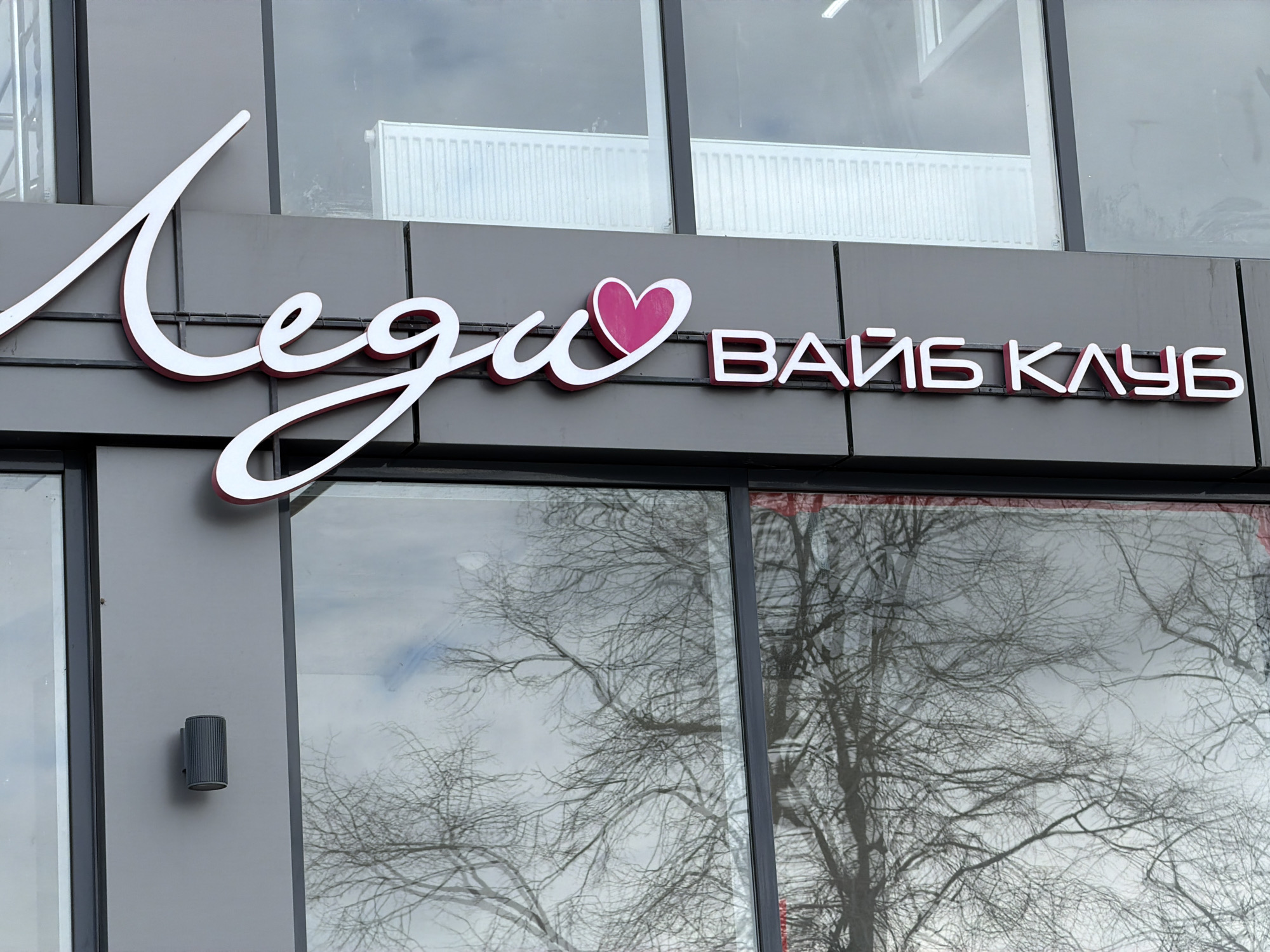 A daytime shot of a commercial building in Yuzhny, Russia features the sign "Лед и Вайб Клуб." The sign, rendered in white with a pink outline, includes a pink heart. The building's facade is a neutral gray. Reflected in the glass windows are leafless trees, indicative of late fall or winter. To the left of the sign is a cylindrical light fixture.