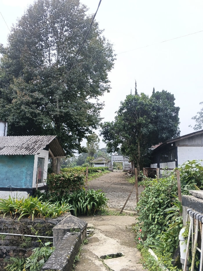 The image displays an outdoor scene in an unknown city or region of Vietnam. A narrow, unpaved dirt path, with sections of worn concrete, extends from the foreground into the midground, leading towards an open, light-colored gate structure. On the left, a small, single-story building with a weathered, corrugated gray roof and a teal-painted exterior, framed by white trim around a window, is partially visible. A concrete wall with visible moss and lichen forms a boundary in the lower left, fronting dense green foliage. A large, mature tree with dark green leaves dominates the upper left, with utility lines crossing the light gray, overcast sky. On the right side of the path, a dense accumulation of green bushes and plants is present, bordered by a rudimentary fence composed of wooden posts and wire. Further back on the right, a white-painted building with a dark roofline is partially obscured by foliage. Beyond the gate in the midground, another small building with a light-colored roof is discernible, surrounded by extensive greenery and additional trees against a hazy background. No individuals, actions, or interactions are depicted.
