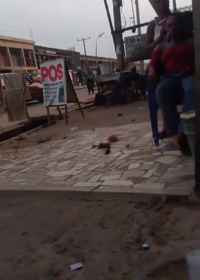 n outdoor scene on what appears to be a street in a town or city. The camera angle is low, and the footage appears to be handheld. In the foreground, there's a paved area with a sandy patch alongside it. Debris is scattered on the pavement. Two women are seated on the right side of the frame: one is sitting on a blue plastic chair and the other is on a wooden barrel. A third woman walks away from the seated women. Across the street, there are low buildings, some displaying signs and advertisements. A sign for "POS AVAILABLE HERE" is prominently displayed on the sidewalk. Utility poles with electrical wires run above the street. A vehicle that appears to be an auto rickshaw or similar public transport is partially visible. People are walking in the background. The sky is overcast.