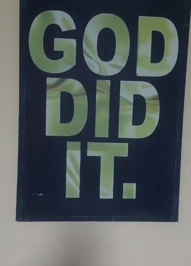 A medium shot depicts a rectangular sign mounted on a beige wall. The sign has a black background, on which the phrase "GOD DID IT." is printed in a large, blocky font, appearing in a faded green color with a subtle marbled texture. The lighting in the scene is slightly uneven, casting a soft shadow. There is some audible speech.