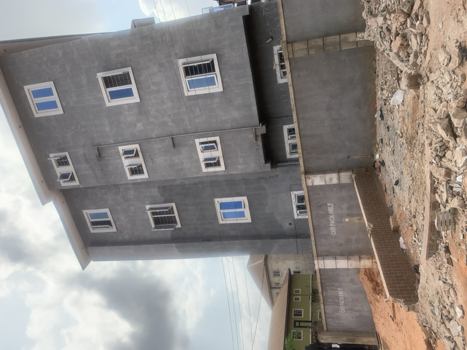 This image, taken in Enugu, Nigeria, displays a five-story building with an unpainted, rough gray cement-rendered exterior
