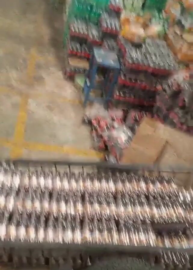 n individual sitting in a warehouse filled with stacks of bottled beverages. The camera focuses on the person's feet, clad in grey flip-flops, and a cart filled with numerous bottles of what appears to be brown soda. Behind the cart are stacks of various beverages including Coca-Cola, Sprite, and other brands in plastic bottles, neatly arranged on pallets. The warehouse floor is grey, marked with yellow lines. A blue stool is visible amidst the stacks. The environment suggests a large-scale distribution or storage facility for beverages.