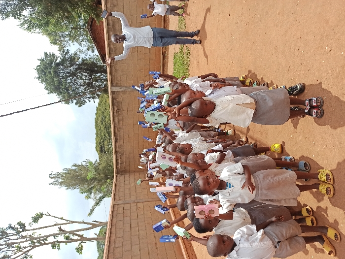 A group of schoolchildren in uniform stand in rows outside a brick building, holding up colorful objects. An adult male stands behind them with his arms raised, while a small child is seen walking further behind him. The scene appears to be a celebration or demonstration of some kind, possibly related to learning materials or a school project. The outdoor setting suggests a schoolyard or open space near the building.