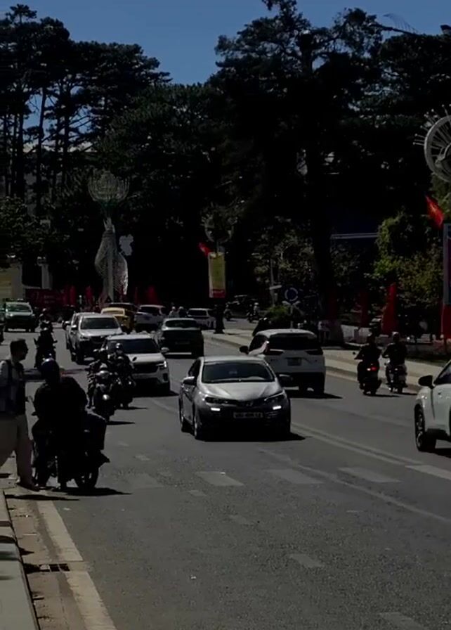 busy street in Vietnam. Cars and motorcycles drive along the asphalt road. The street is lined with trees and sidewalks. Pedestrians are crossing the street. There are Vietnamese flags hanging along the side of the road. The sky is blue and sunny.