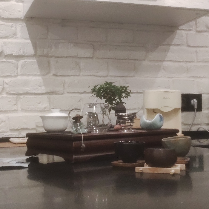 - "A dark wooden tray sits on a counter, holding a white bowl, a glass teapot, a small plant, and several small cups" by FM-TzA0d2, licensed under CC BY 4.0