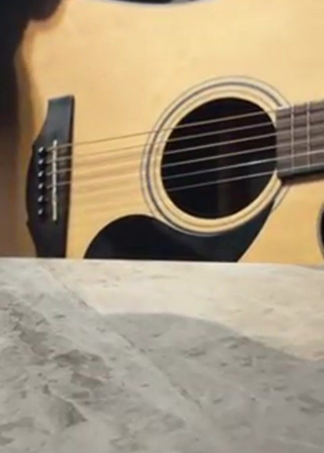 A person wearing a black sweater strums an acoustic guitar in front of a grey countertop