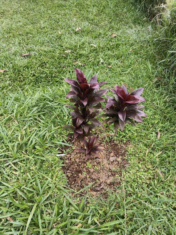 The image depicts an outdoor ground scene in Bien Hoa, Vietnam. Three plants with dark reddish-purple, lanceolate leaves are centrally positioned, rooted in a circular patch of brown, exposed soil approximately 40 centimeters in diameter. The tallest plant, standing about 40-45 cm high, is located centrally, with another plant of similar species, approximately 30-35 cm tall, positioned to its right. A smaller plant, roughly 15-20 cm high, grows at the base of the central plant. The soil patch is encompassed by a dense, vibrant green lawn of varying grass types, some appearing manicured and others slightly overgrown. Scattered brown leaf litter is visible on the grass in the background. A thin, white, elongated object, possibly synthetic material, is partially visible amidst the grass blades to the lower-left of the main plant cluster. The scene is illuminated by ambient natural light.