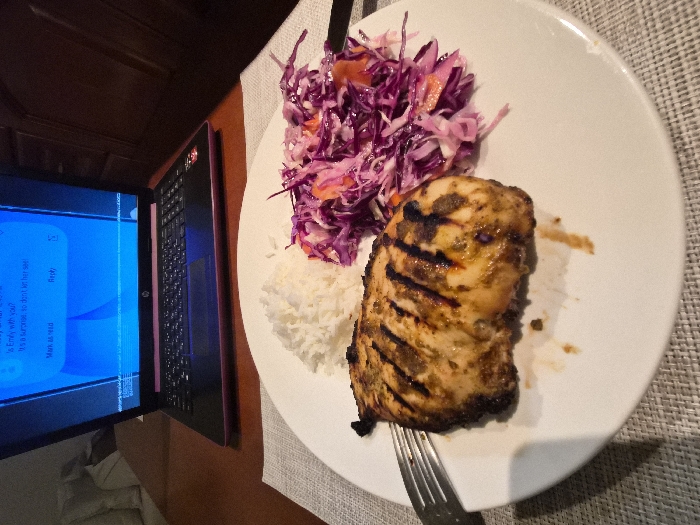 The image displays an indoor scene featuring a prepared meal and an active laptop on a wooden table. The specific location within the Municipal Unit of Corinth, Greece, cannot be determined from the visual evidence. In the foreground, a white, round plate rests on a grey, textured placemat. The plate contains a grilled chicken breast, exhibiting distinct char marks and visible seasoning, alongside a portion of white rice. Adjacent to these, a salad composed primarily of shredded purple cabbage and orange slivers, likely carrots, is present. A silver four-tine fork is positioned on the left side of the plate, partially underneath the chicken. Minor food residue is visible on the plate beneath the chicken. In the midground, a black HP laptop with a pink or purple lower chassis trim is open on a dark brown, polished wooden surface. The laptop screen emits a bright blue light and displays a user interface, consistent with a messaging application, showing fragmented text that includes "is Emily with you?" and "It's a surprise, so don't let her see!". The background, largely out of focus, reveals a light-colored upholstered object on the left, possibly a chair or sofa, and darker wooden furniture or paneling on the right. No individuals are visible in the scene.