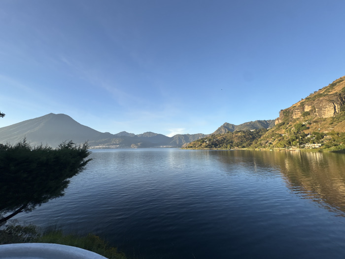 The image displays a panoramic landscape captured from San Pablo La Laguna, Guatemala, overlooking Lake Atitlán. The scene is dominated by the expansive dark blue waters of the lake, which occupy the central and lower portions of the frame, exhibiting subtle surface ripples. The sky above is clear and light blue, with minimal high-altitude cloud formations. To the far left, a prominent, conical volcano, consistent with Volcán San Pedro, rises distinctly from the horizon, partially obscured by a slight atmospheric haze. Adjacent to this, other mountain ranges and distant lakeside settlements are discernible along the shore. The right side of the image features a steep, rugged hillside ascending directly from the lake's edge. This hillside is characterized by exposed, light-colored rock formations and interspersed green vegetation, illuminated by direct sunlight. Numerous small, light-colored buildings with distinct roofs are visible, nestled into the contours of this populated hillside. In the immediate foreground, to the left, a dense mass of dark green evergreen foliage partially obstructs the view of the lake. At the very bottom edge of the frame, a curved, light-colored object, possibly a railing or part of a structure, is partially visible. No individuals or explicit actions are observed within the scene.